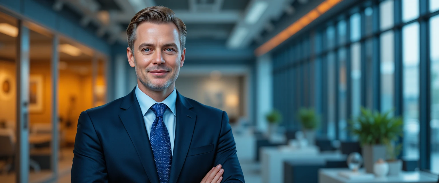 A young professional in formal business attire standing at the beginning of a government office hallway